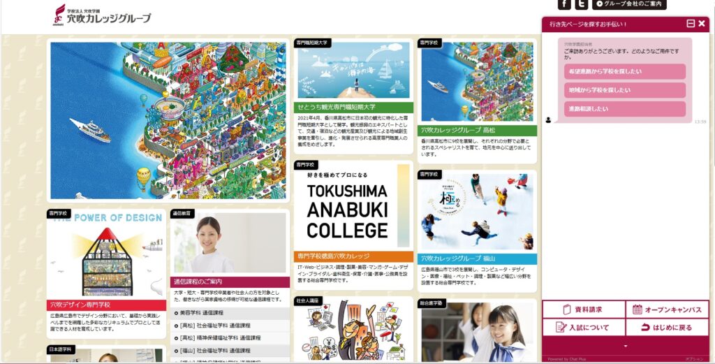 私が6年前に異動で現職に就いた時、グループのホームページを改めてしっかりと見て、どこに行ったらどんな情報があるか、よく分からないということに気づきました。当然、メニューはあるのですが、例えば、高松でデザインについて学びたい、福山でプログラミングについて学びたいと思った人が、自分の行きたい学校の情報になかなかたどり着けないという課題があるように感じました。そこで、情報の案内板のようなものがあればもっと便利にホームページを使ってもらえると思ったのが、まずChatPlusのチャットボット導入のきっかけになりました。展示会などを通じて、いくつかのチャットツールのお話をお伺いし、圧倒的に導入しやすい価格のChatPlusに決めました。