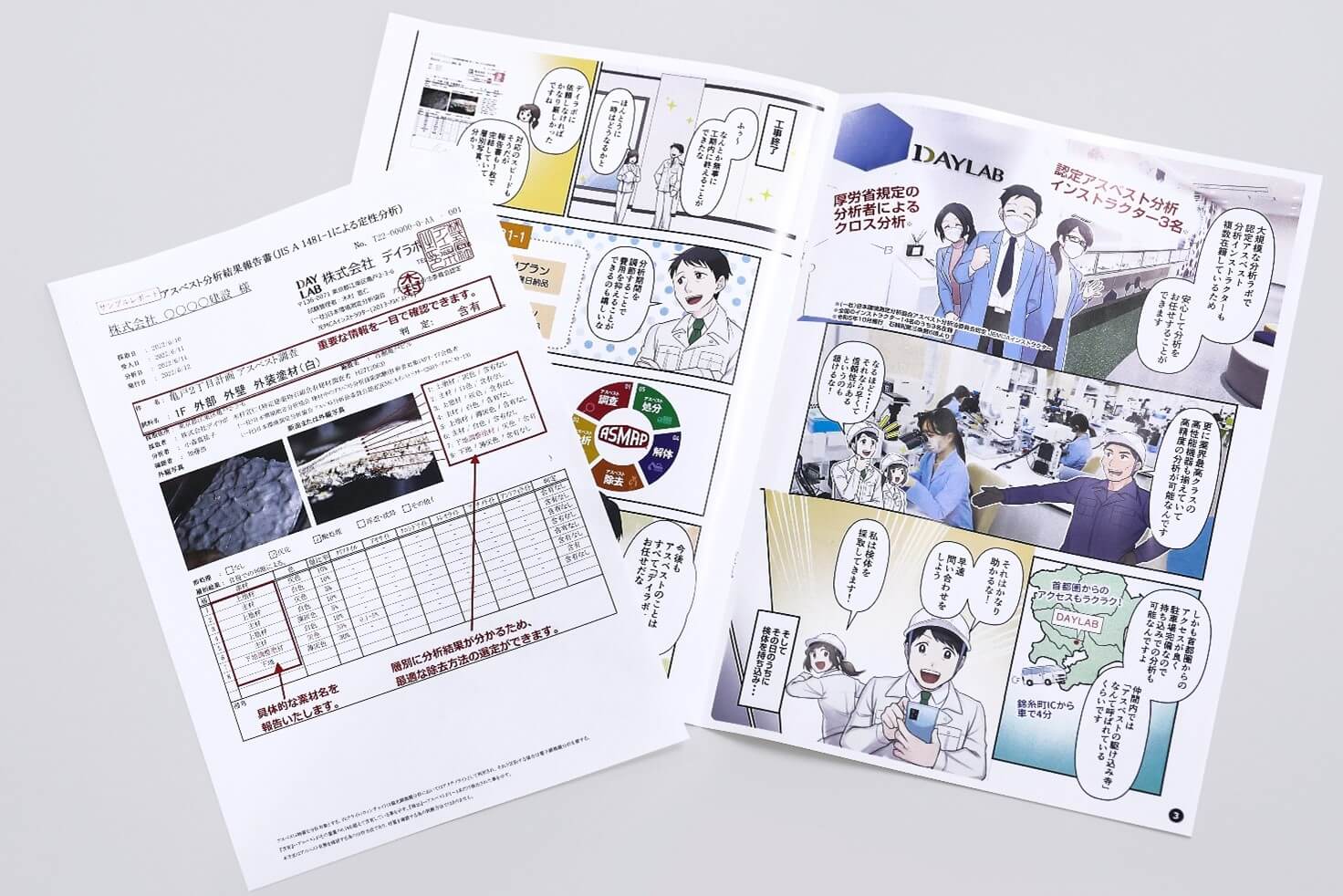 私たちの大きな特長は、分析受付から24時間以内にメールで分析結果報告書をお届けする「1DAYプラン」をご提供していること。解体工事を始める前に、過去の図面を見て、ここに含まれているだろうと分かることがありますが、改修により、継ぎ足し、継ぎ足しで建材が増えている建築物もあります。解体を始めてみたら、実は壁などに図面上にはない建材があることが分かり、調べるまでは工事がストップして、大きな損害を出してしまうことがあります。お客様が少しでも損失を出さずに済むよう、スピーディに分析結果をご提供できる体制を備えているのが、私たちの強みです。また、誰が見てもわかりやすい独自の分析結果報告書も特徴であり、多くのお客様から御好評頂いています。