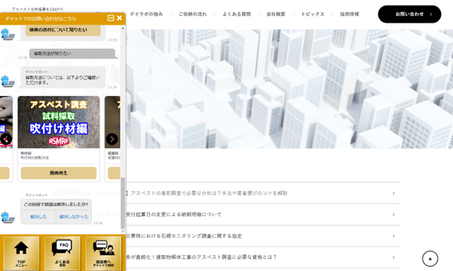 グループ会社のアスマップも、アスベストの「調査」を行っている会社なので、いろいろな問い合わせがあります。2023年の後半からアスマップでもWebでの集客を始めていきたいとのことですので、その時にはChatPlusのチャットボット設置を検討したいと思います。