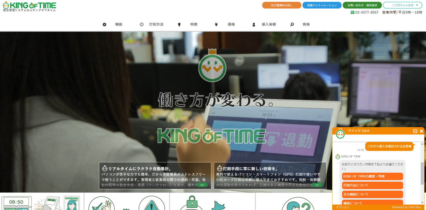 有人チャットへお問い合わせいただくお客さまというのは、「KING OF TIME」のご利用がより具体化しているお客さまです。そういうホットなお客さまに対して、より丁寧な対応ができるようになったことは、ChatPlusの導入効果としてとても大きいと思います。実際、ChatPlusを始めてから1~2カ月というところでレポートをチームで共有したのですが、チャットを経由したコンバージョンがかなり上がっているということで好評でした。現在も、月平均300件のチャット訪問があり、そのうちおよそ50件、約17%のお客さまが無料体験、もしくはお問い合わせをいただくというコンバージョンに至っています。
