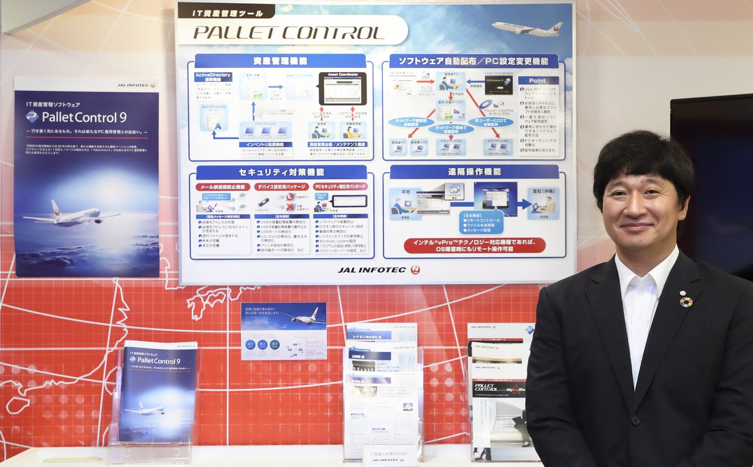 JALグループのIT中核会社であるJALインフォテックは、安全・安心・快適な航空輸送サービスを支えるITソリューションの数々を開発し、JALグループ各社へ提供することが重要な役割です。同時に、JALグループへのITソリューションの提供で培われた知見を製品化し、JALグループ以外のさまざまな業種の企業へ積極的に提供しています。その1つが、私たちが担当しているPalletControl(パレットコントロール)というIT資産管理のパッケージソフトウェアです。もともとは、日本航空が本社を移転する際に、PC管理のために開発したソフトウェアで、非常に便利だと社内の評価が高かったことから他社への販売を始め、およそ23年、多くの企業にご利用いただいております。特長は、保守更新率の高さやJALグループでの長年にわたる使用実績があり、非常に信頼性が高いということです。また、スクリプト言語を使って他のソフトウェアではできない作業も実現することができる、という小回りの利きやすさが強みとなっています。