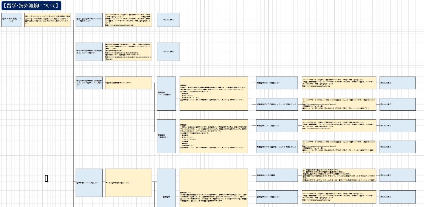 チャットボットのシナリオや表示するテキストは、各担当者が作成しています。全てを私1人で管理するのはなかなか難しいので、私のほうでフレームを作って、それぞれのチャットボットのシナリオをツリー図化しています。