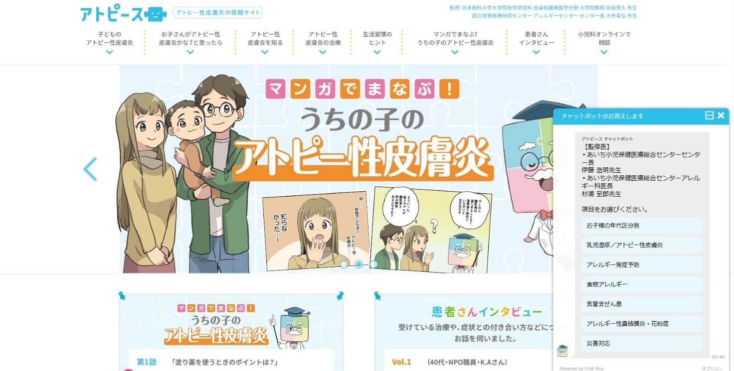 今回、ChatPlusのチャットボットを導入したのは、「アトピース」というアトピー性皮膚炎に関する情報発信のWebサイトになります。アトピー性皮膚炎については、関連する情報がネット上に多数流れていて、何が正しいのか分からない人たちも多いという状況です。製薬メーカーとしてエビデンスに基づいた正しい情報を届けるということを目的に立ちあげたのが「アトピース」です。