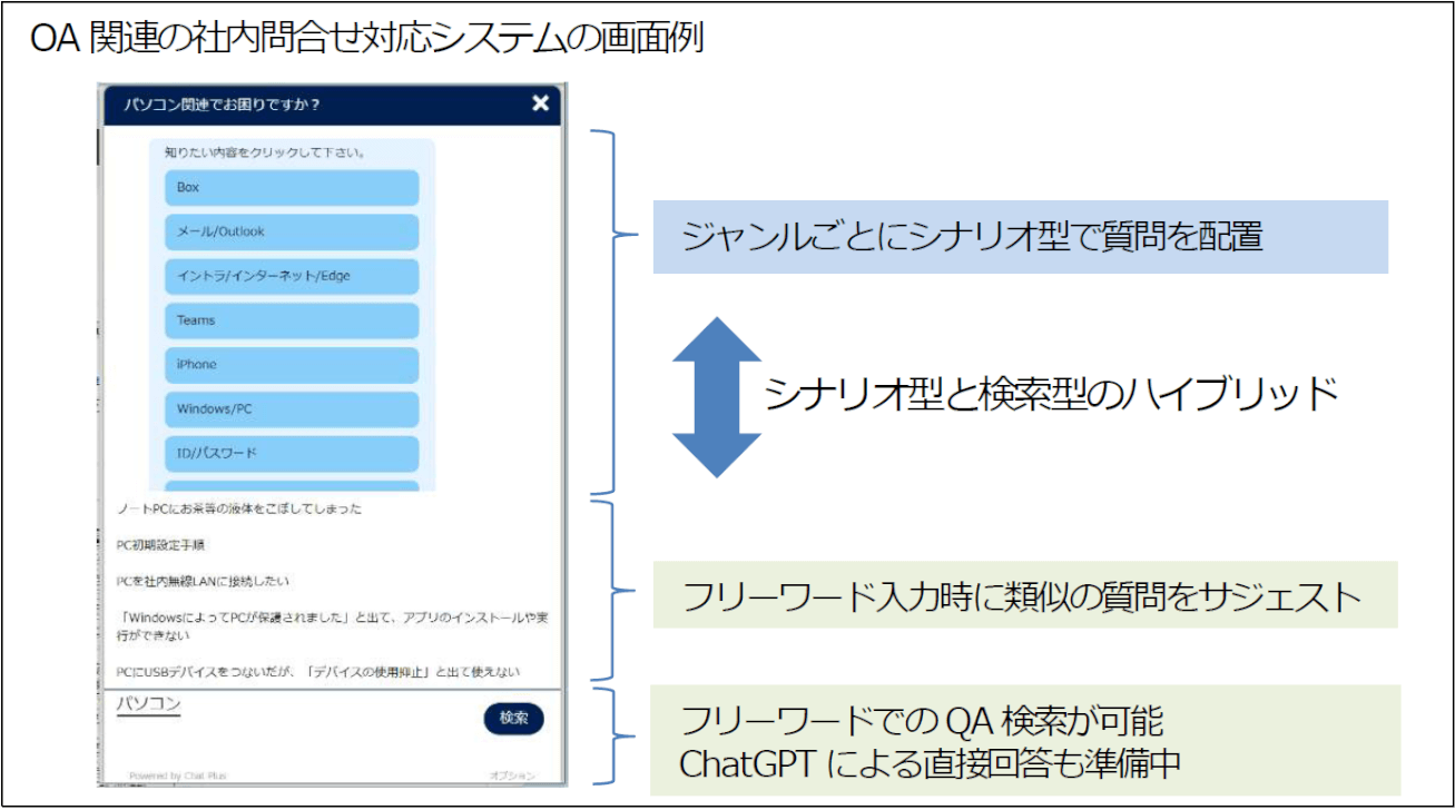 私たちにはユーザーサポートセンターでの成功事例がありました。基本的にOAの問い合わせは本社でも工場でも関連会社でも共通していることなので、また一から立ち上げるのではなく、ユーザーサポートセンターのチャットボットをブラッシュアップして、全社展開システムを立ち上げようというストーリーになりました。
