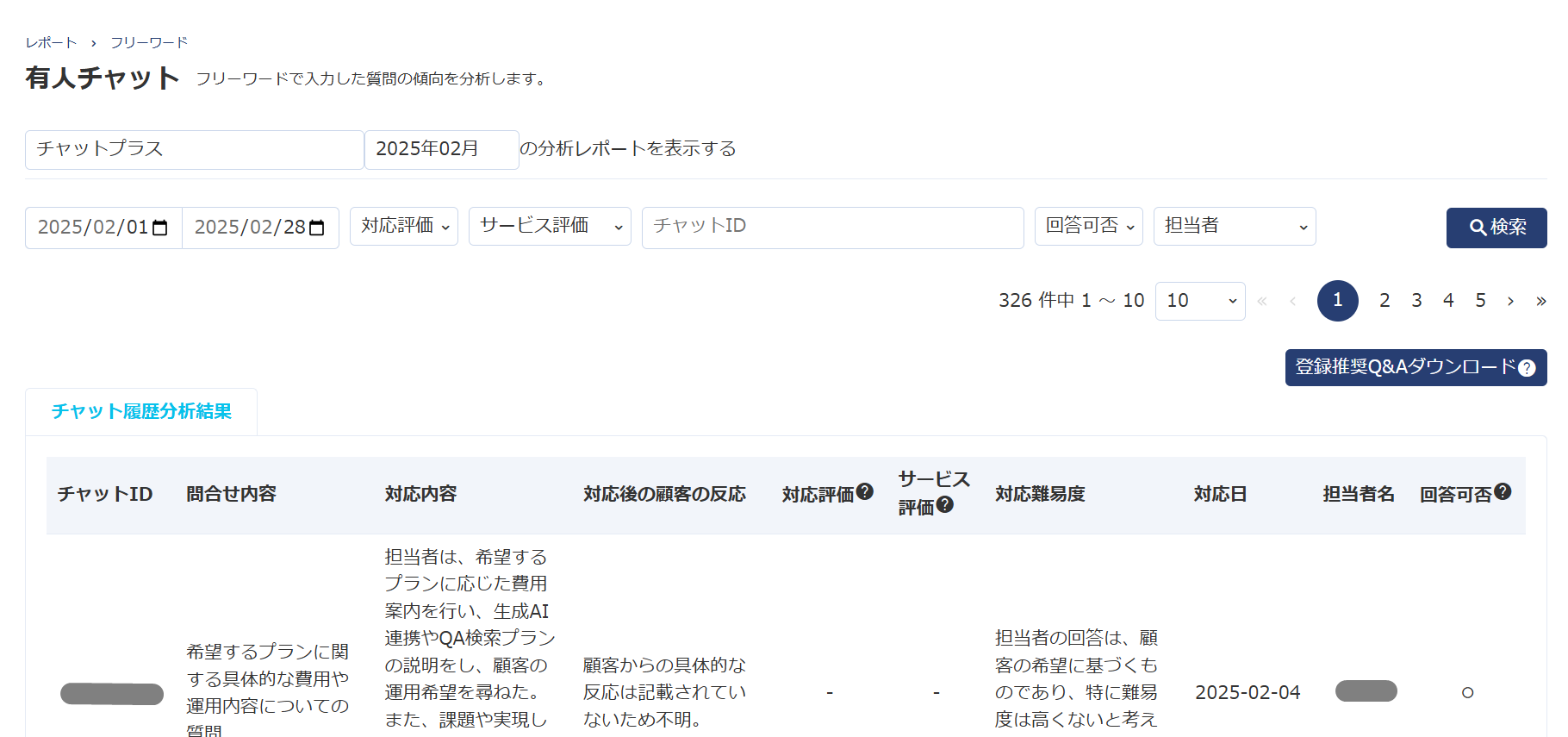AI分析レポート(有人チャット)をリリースしました。有人チャットの履歴をAIが分析し、対応及びサービス(商品)評価を分析します。また、評価結果の絞り込みもできます。