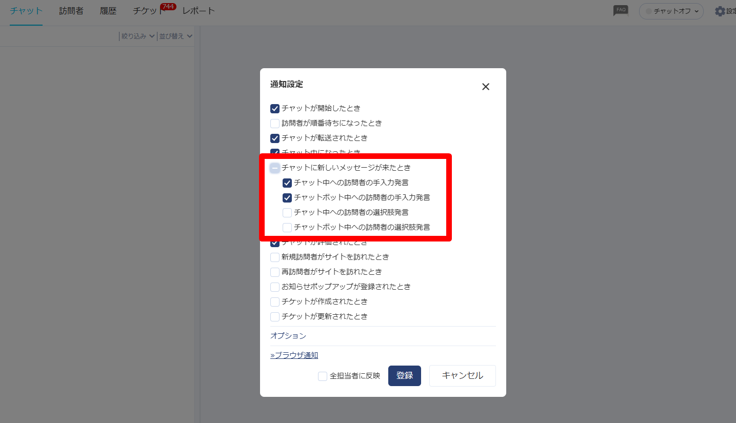メール通知、アプリ通知、ブラウザ通知の通知内容がより簡単に設定できるようになりました。特別な設定がなくても、チェックをいれるだけで「有人チャットの時のみ」、「チャットボットへのフリーワード入力時のみ」などの通知タイミングを指定いただけます。