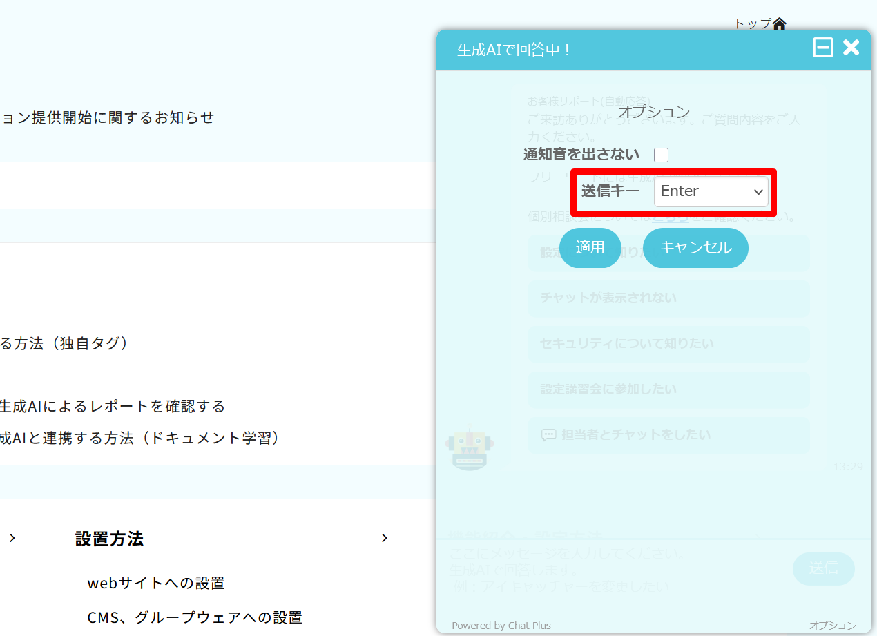 訪問者側で送信キーが指定できるようになりました。右下のオプションから変更できます。