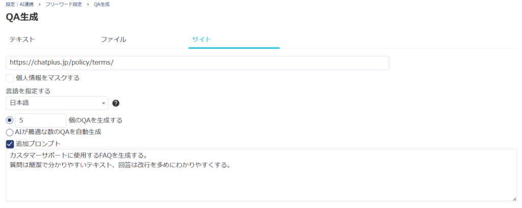 テキスト、ファイル、サイトからQ&Aを生成する際に、追加プロンプト(AIへの指示出し)を設定できるようになりました。