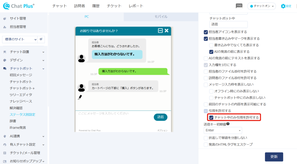 チャット中に送信されたメッセージを引用できる機能をチャット中(有人対応)のみ有効にできる機能を追加しました。