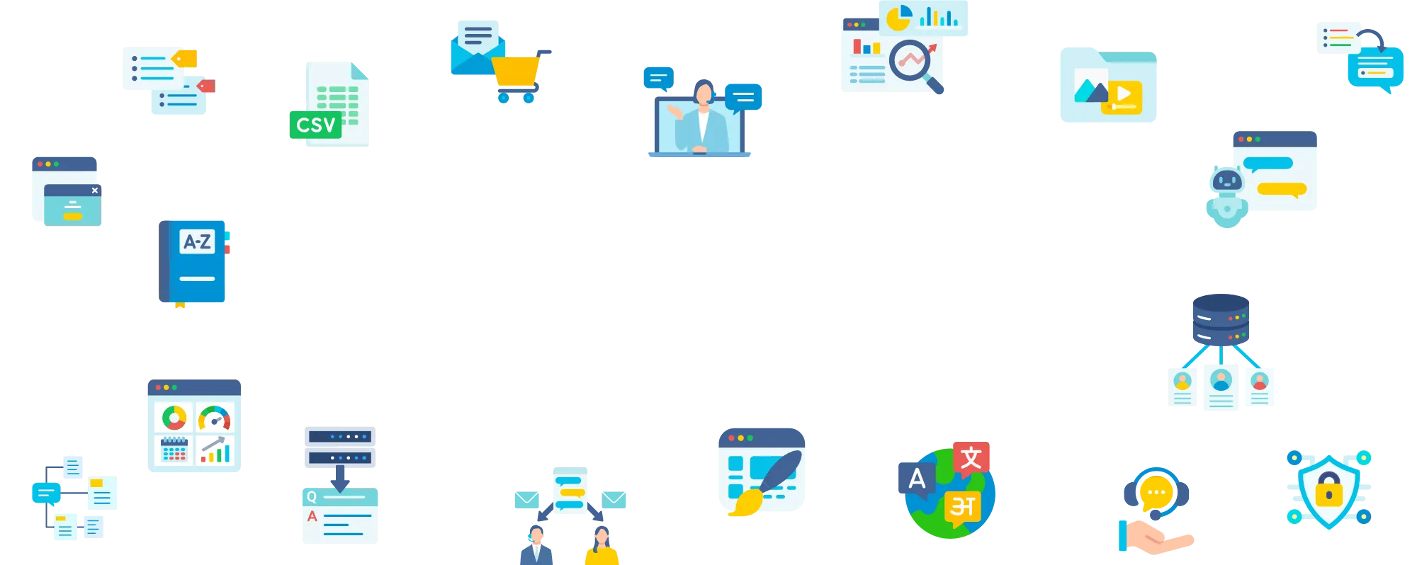Q&A生成機能 / 自動キーワード生成機能 / 追加Q&A推奨判定 / 追加プロンプト / 辞書登録 / シナリオ設定 / ツリーエディタ / ウィンドウデザイン / CSSカスタマイズ / 履歴CSVエクスポート / チャットボットデータCSVエクスポート / 詳細レポート / チャットボット分析 / 頻出単語レポート / ワードクラウド / 各種ファイル添付 / 画像送信 / 動画送信 / 担当者ルーティング / カテゴリ設定 / タグ設定 / 企業情報付与 / 通知アプリ / ナレッジベース (模範解答集) / 定型文 / NGワード / タイマー機能 / お知らせポップアップ (リード) / 吹き出し機能 / Cookie許諾バナー表示 / ユーザ情報連携 / 各種API連携 / IPアドレス制限 / 各種セキュリティ設定 / SSO / 操作ログ / 多言語対応 / チケット(メール)機能 / FAQPlus連携 / その他多数