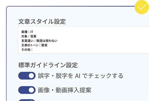 記事を手動で作成、また各種シーンにおける自動記事作成時、AIがガイドラインをチェックし、記事の品質を保ちます。